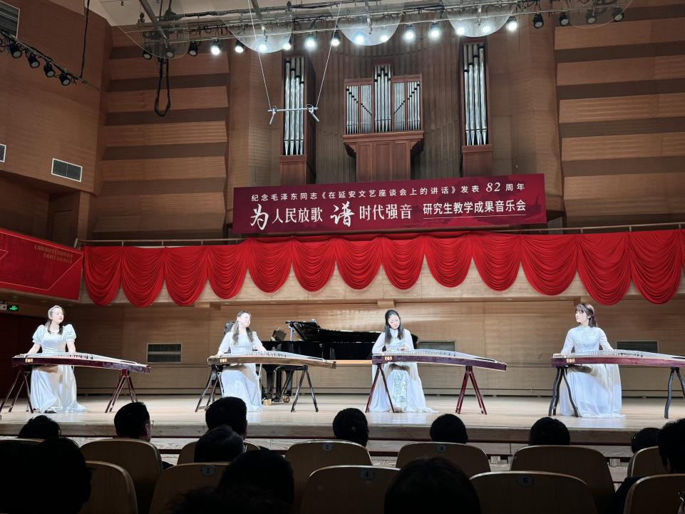 在研究生教学成果音乐会上,艺术学院选派的音乐专业硕士研究生古筝合奏《山丹丹开花红艳艳》、女声合唱《葡萄园夜曲》两部作品与省内音乐专业硕士研究生培养单位同台竞技,这是我院首次参加省内音乐专业硕士研究生培养单位教学成果交流展演。学生们的精彩演出博得现场阵阵掌声,展现了我院硕士研究生的培养质量。